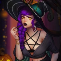 an illustrated character who appears to be a witch, celebrating Halloween. She has