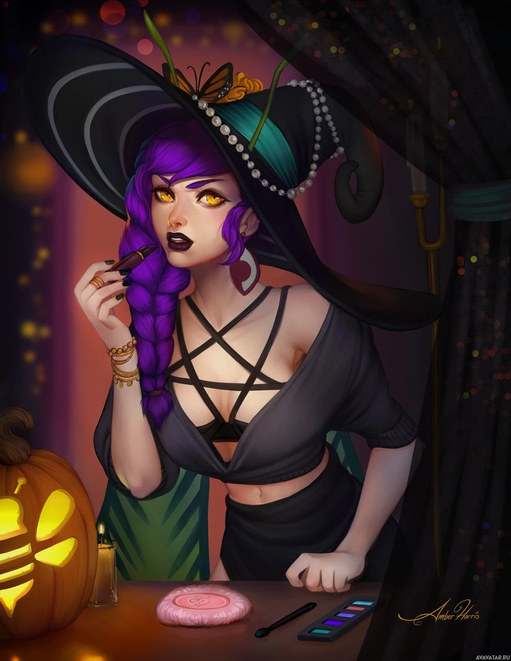 Halloween decorations, including jack-o'-lanterns and other festive items. In her hand, she holds a brush and what looks like makeup, suggesting that she might be getting ready for a costume or transformation. There's also a pinkish