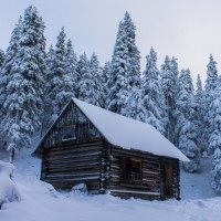 a log cabin with a sloped roof and two visible windows. The cabin is surrounded by more trees, indicating that it's likely in a remote or forested area. There are no people visible in the picture, which gives it a peaceful and serene atmosphere.