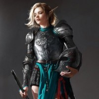 a female character dressed in armor, with blonde hair. She is holding a shield and sword, suggesting she may be portraying a warrior or combatant from
