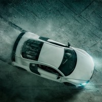 The image features a white sports car with a dynamic pose, suggesting speed and movement. It appears to be a high-performance vehicle designed for racing or high-speed driving on the road or track. The background has an artistic blur that gives it a sense of motion and intensity.