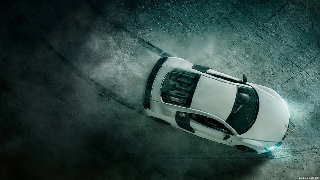 На картинке изображен белый спортивный автомобиль с динамической позой, предполагающей скорость и движение. Похоже, что это высокопроизводительный автомобиль, предназначенный для гонок или высокоскоростного вождения на дороге или трассе. Фон имеет художественное размытие, которое придает ему ощущение движения и интенсивности.