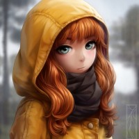 red hair wearing a yellow hooded coat and a scarf. She appears to be standing in what looks like a rainy or misty