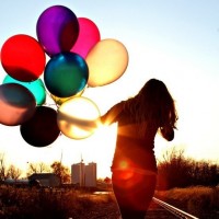 На картинке изображен силуэт девушки, стоящей на железнодорожных путях. Она держит несколько красочных воздушных шаров, а солнце садится за ней, создавая теплый эффект свечения. Сцена передает чувство безмятежности и радости, обычно связанные с праздниками или особыми моментами.