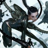 a female character with black hair, dressed in a futuristic or science fiction outfit. She is holding a weapon that appears to be