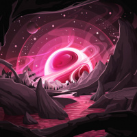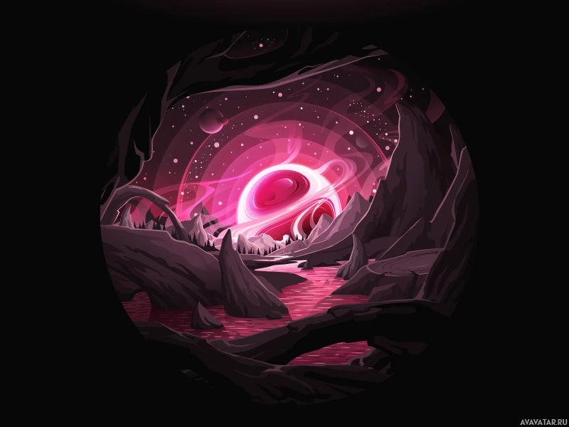 a surreal landscape featuring a large, pink celestial body that resembles the moon or sun. This celestial body is prominently positioned in the center of the image and casts light over