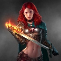 red hair and is wearing armor and a cloak that suggests she might be a character from a story or game set in a medieval or fantasy setting. The character is holding a sword with her left hand, which has flames flickering around it, indicating that the sword may have a magical or enchanted quality related to fire.
