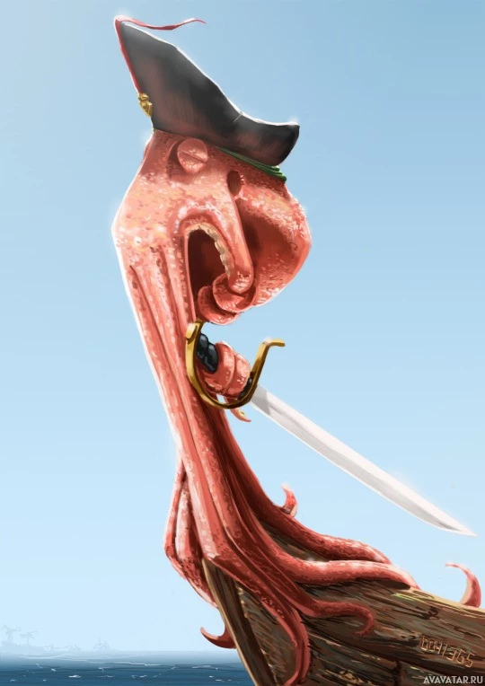 a whimsical scene where an octopus has the appearance of a pirate. It's holding a sword in its right tentacle and is adorned with a gold chain and