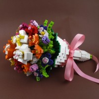 pink bow is attached at the bottom to give it a decorative touch, which adds to the charm of the arrangement. This kind of Lego art can be both fun and artistic, using