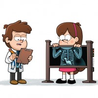 a pink dress and holding a skeleton with an X-ray image on it. Both characters are standing next to each other, suggesting they might be examining or discussing something related to the skeleton's condition. The background is simple, with no distinctive features that would identify