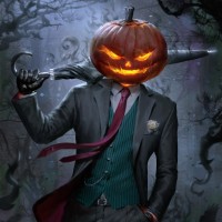 a confident expression. The background depicts a dark and eerie setting, possibly inspired by Halloween themes, with