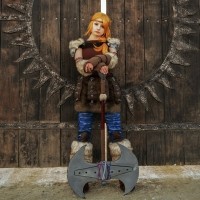 fantasy clothing, including a corsette that seems to have a fur trim around the neckline, and she has a garment resembling a tunic or armor over it. The girl is holding what looks like an axe with both hands, resting on her shoulders. Behind her is a large wooden door with a carved design in the center that might be interpreted as a sun motif, surrounded by