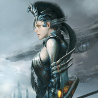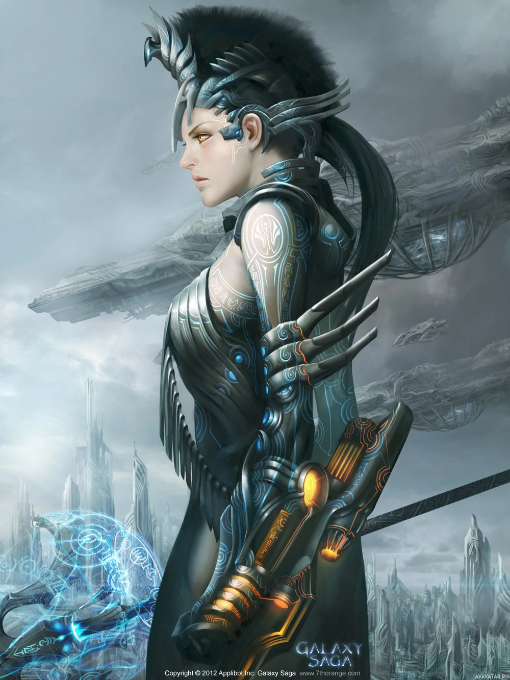 a science fiction setting. She is wearing an armor-like outfit with various technological elements integrated into it, suggesting a futuristic or advanced technology theme. Her helmet has a visor that covers her eyes, and she carries what looks like a weapon on her hip. The background features futuristic architecture and flying vehicles, which are typical of science