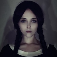 На картинке изображен человек, одетый в черное платье с белой отделкой, напоминающее наряд, обычно ассоциируемый со Средней Аддамс из серии «Семейка Аддамс». Они держат череп между руками и имеют интенсивное выражение лица.