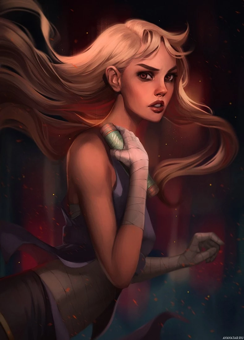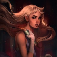 a young woman with long blonde hair. She is wearing some form of armor or combat gear, suggesting she might be a warrior or part of