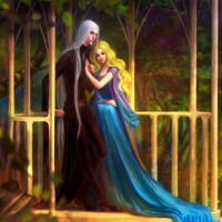 setting sun casts a warm glow over the scene, enhancing the romantic or mystical atmosphere. The artwork has been described as having elements of fantasy and love, which could be inferred from the characters' interaction and their