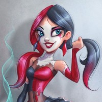 a magical effect at her feet. The artwork showcases Harley Quinn in a stylized and dynamic pose, capturing the essence of the character's energetic and unpredictable nature.