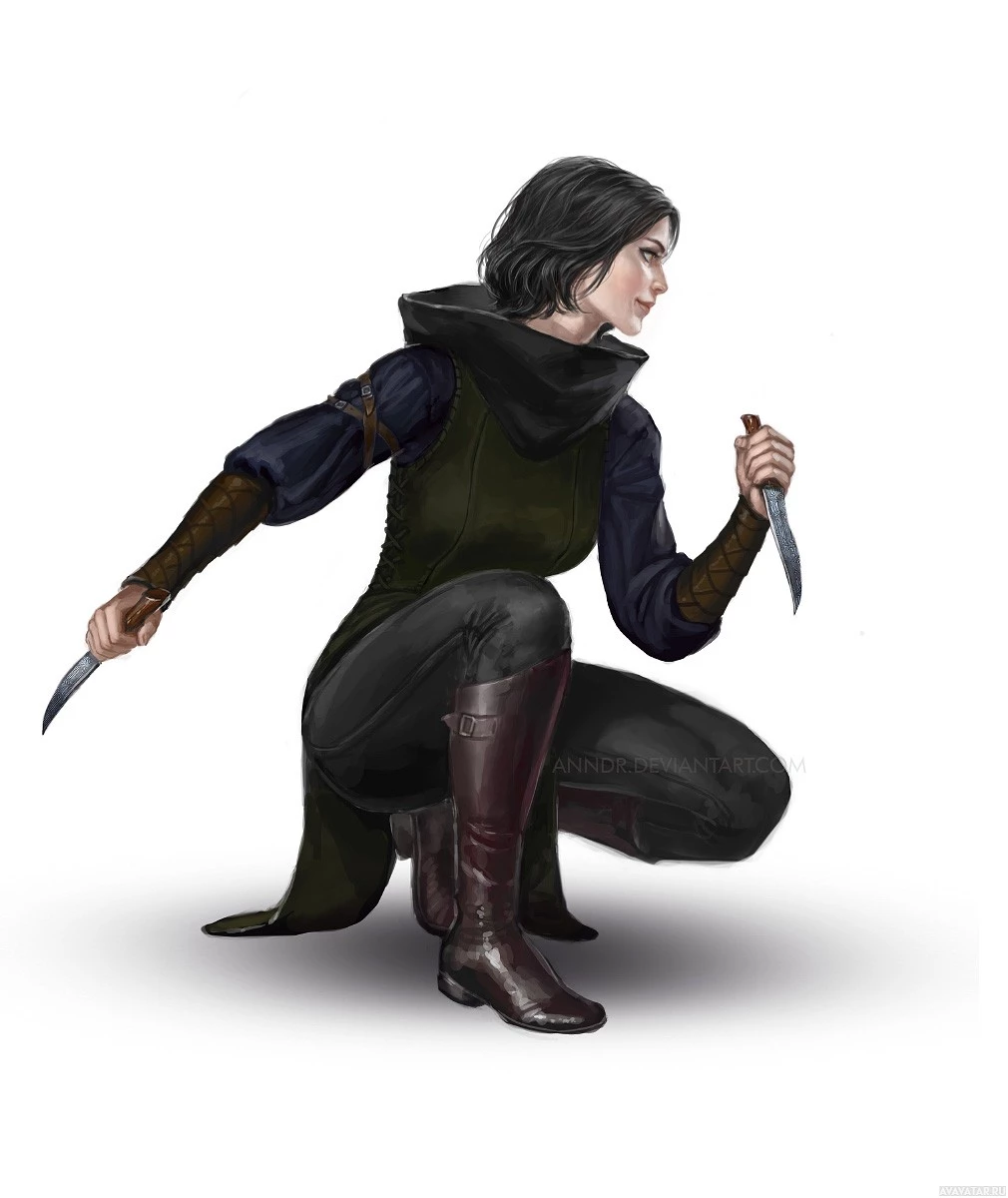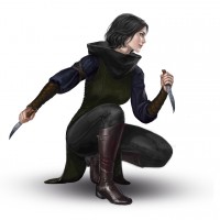 dark hair, is dressed in attire that suggests an adventurous or warrior-like role, and is holding two knives crossed over each other in front of them. They are depicted in a pose that might indicate readiness for combat or action.