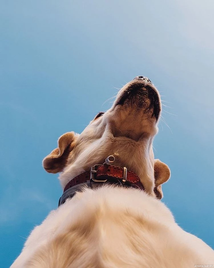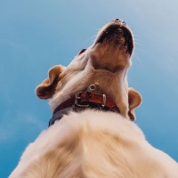 blue sky in the background. The dog is looking upwards and has its mouth open, possibly barking or howling. The picture captures the dog's expression and posture very well, giving