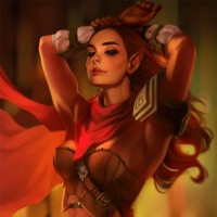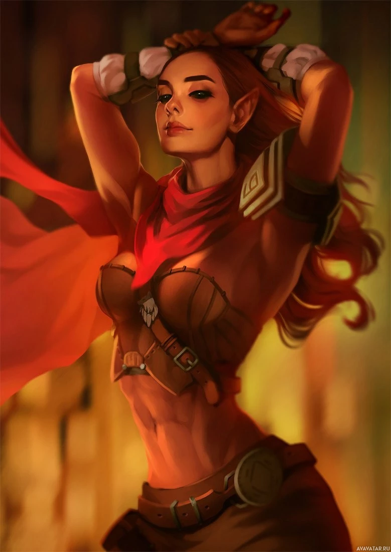 Картинка показывает женскую героиню, которая кажется эльфом из-за ее острых ушей и рыжих волос. Она носит доспехи и аксессуары, которые предполагают роль воина или авантюриста в вымышленной обстановке. Ее поза и выражение передают уверенность и готовность к действию.