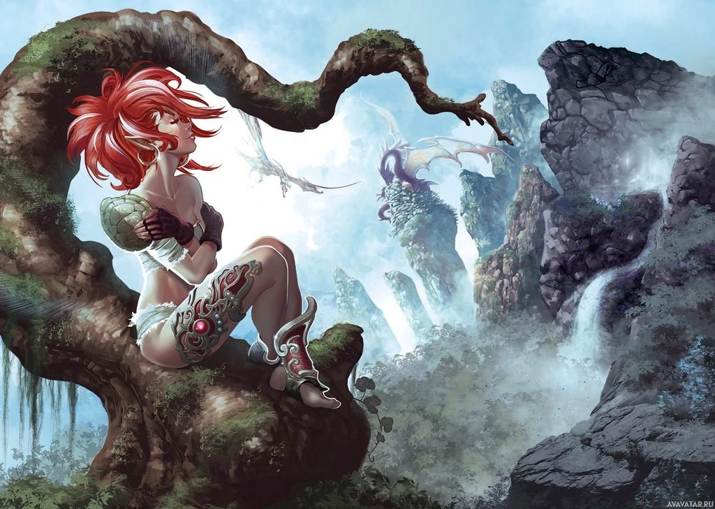 a tree branch, which the elf is leaning against with one arm. In the background, there's a lush green forest and rocky cliffs under