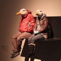 На картинке изображены две чучела чайки, сидящие бок о бок. Они одеты в человеческую одежду; один одет в красную куртку, а другой в серую куртку с капюшоном. Этот вид дисплея можно найти в музеях или магазинах, которые продают чучела животных, которые часто размещены, чтобы имитировать сцены из повседневной жизни, чтобы сделать их более реалистичными и привлекательными для зрителей.