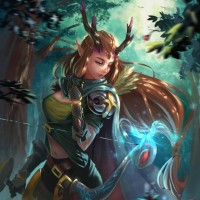 long hair and pointed ears, typical characteristics of elves in many fantasy stories. She is wearing armor that includes shoulder guards with what appears to be a stylized dragon or wyvern emblem. In her left hand, she holds a bow that's not being used at the moment, suggesting she might be taking a rest or preparing for battle. There are also various magical elements around her, such as a sparkling blue energy in her right hand and an illuminated crystal on her chest, which could imply that she has some