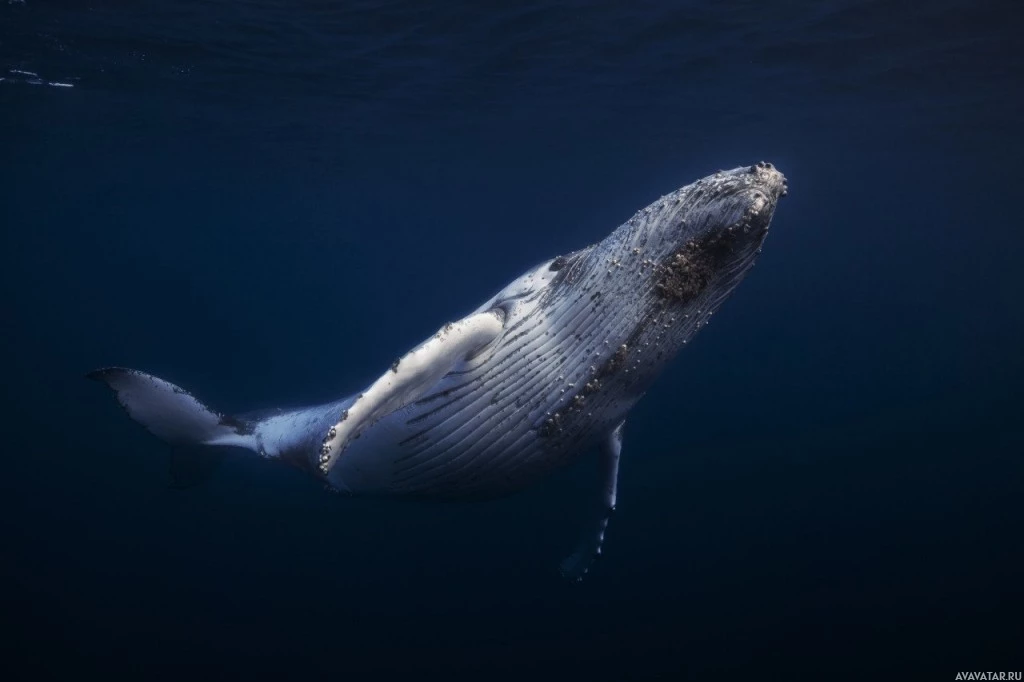 На снимке изображен кит, плавающий под водой. Это одно животное, вероятно, горбатый кит, учитывая видимый спинной плавник и большую форму тела. На картинке нет текста или каких-либо других объектов.