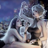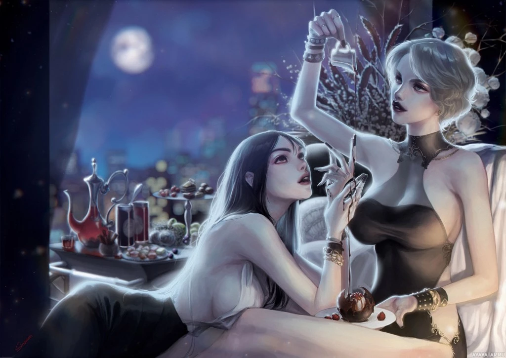 supernatural setting. One character is lying down, while the other stands beside her, both appearing to be engaged in