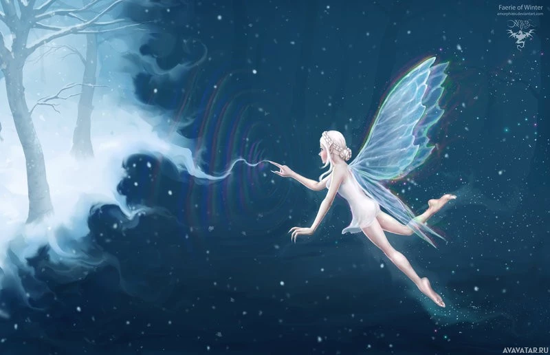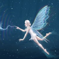 a flowing dress, giving the impression of a fairy or a magical being from a story or myth. The setting appears to be a dark