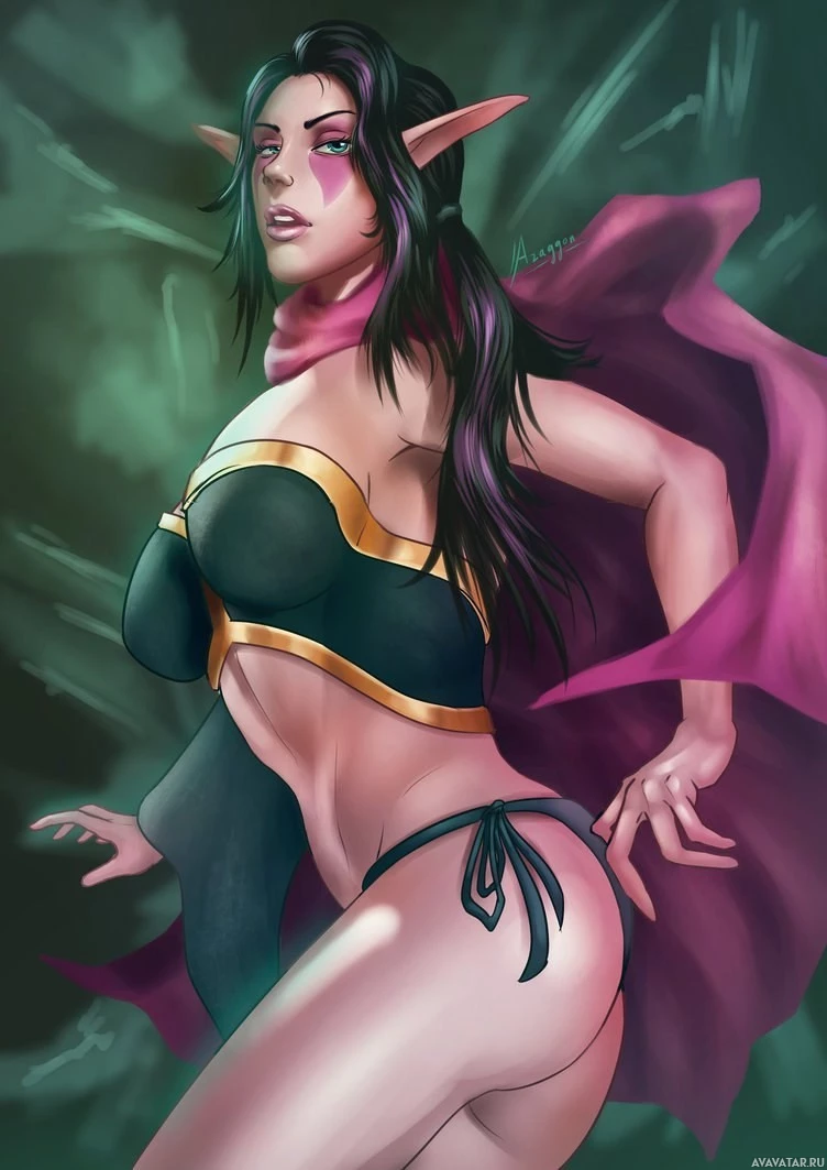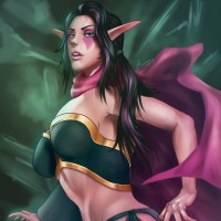dark hair, is wearing a black outfit with gold accents, and there's a pink scarf or cape draped around her shoulders. The artwork portrays her in