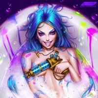 blue hair, appearing to be a girl or woman. She is depicted sitting in a bath filled with colorful bubbles and vibrant, splashing water, giving