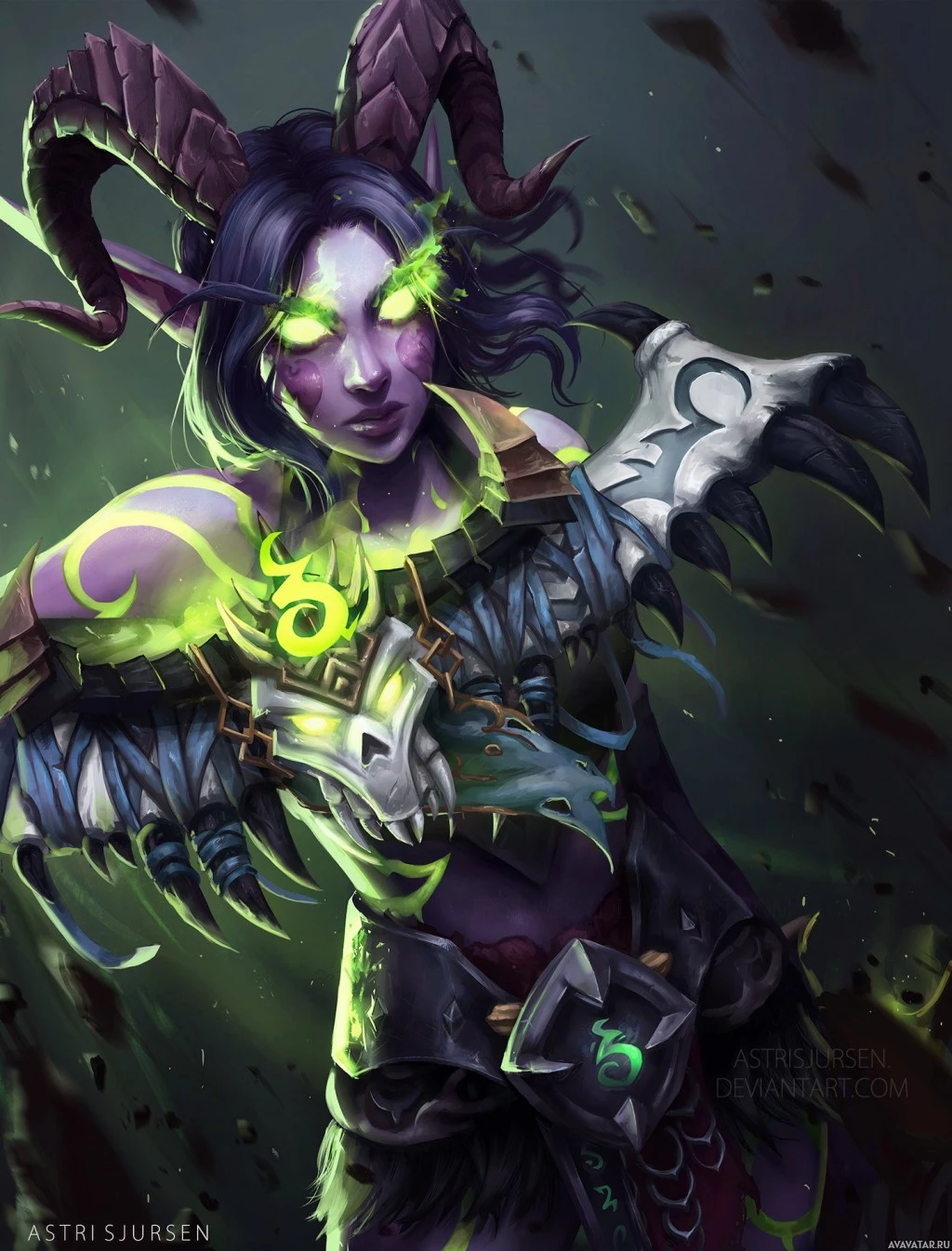 prominent horns on their head, which could be interpreted as a demonic or mythical feature. They have pointed ears, similar to those of elves in many