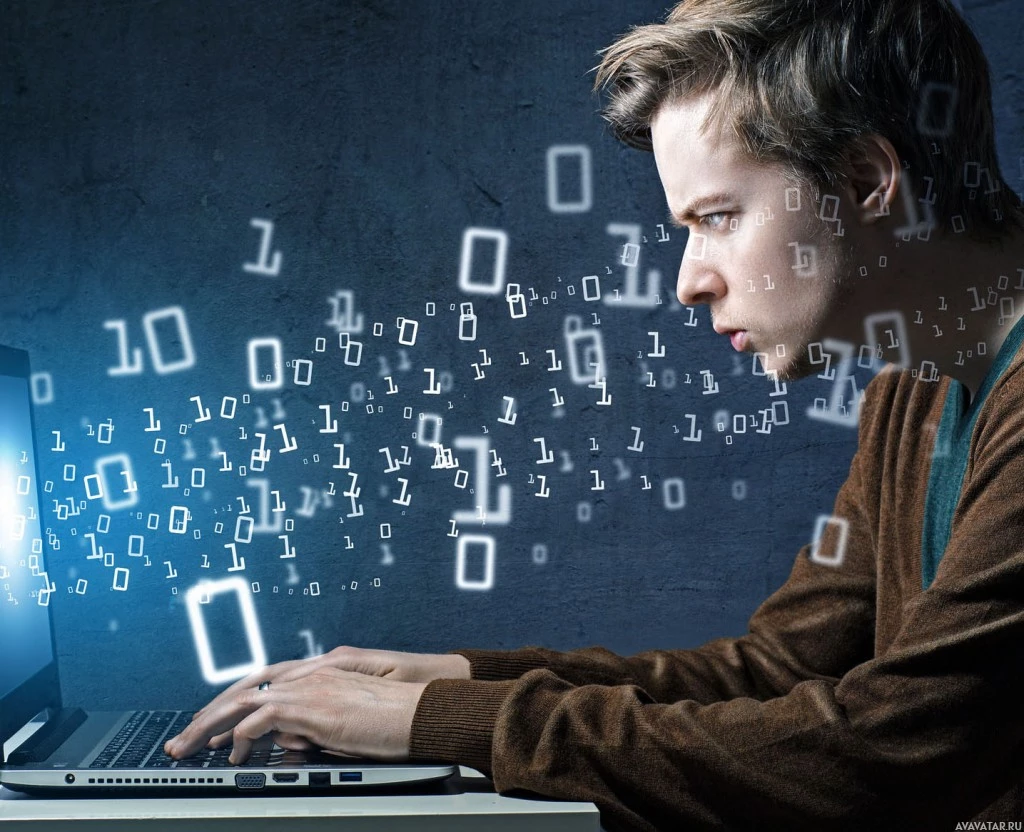 binary digits (0s and 1s), indicating a theme related to digital technology, programming, or data processing. The overall atmosphere suggests a sense of concentration and focus on