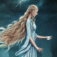 golden hair and is dressed in a flowing robe with a tiara on her head, embodying the elegance and wisdom associated with her character. The background suggests a moody or perhaps a scene from one of the stories set in Middle-earth.