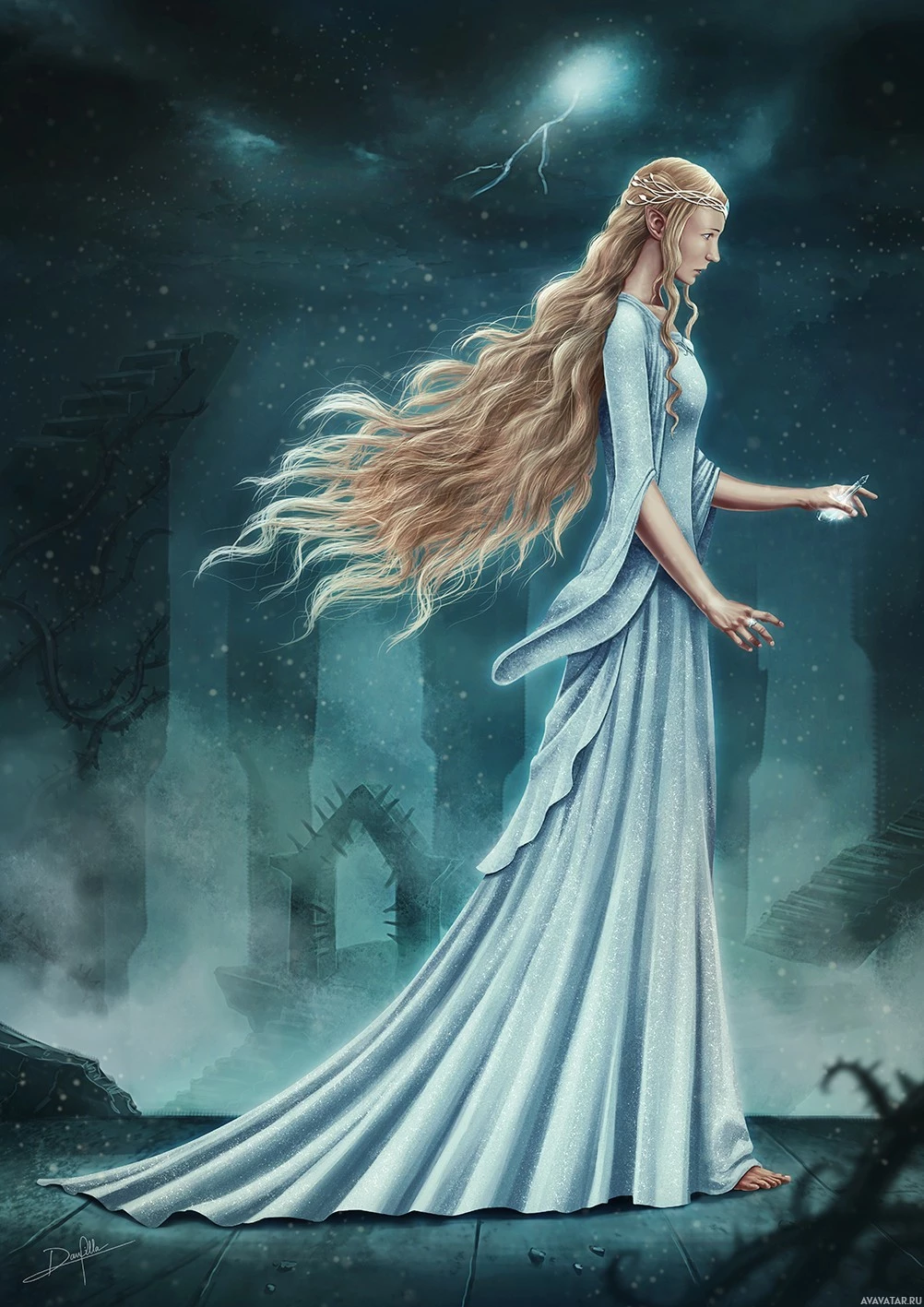 This is an image of a character depicted as Galadriel from the works of J.R.R. Tolkien, particularly in "The