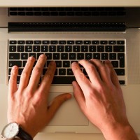 The image shows a close-up view of a person's hands working on a laptop keyboard. The individual is typing or using the computer for some task, and their focus seems to be on the screen or task at hand. This scene depicts common use of technology in daily life.
