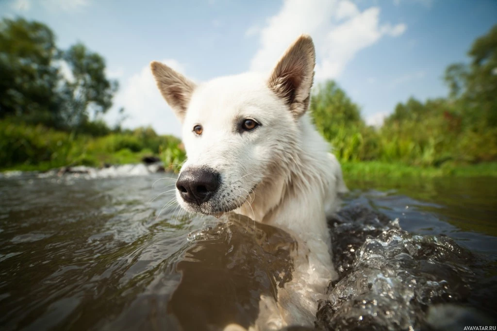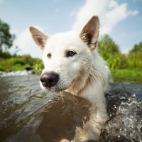 In the picture, there is a dog. The dog appears to be in water, possibly a river or stream, and it's wearing a collar. It looks like the dog might be retrieving something from the water, which could suggest that this dog is trained for tasks such as