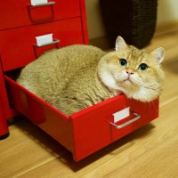 filing cabinet, which has several drawers, one of which the cat is occupying. There is a chair visible on the left side, and