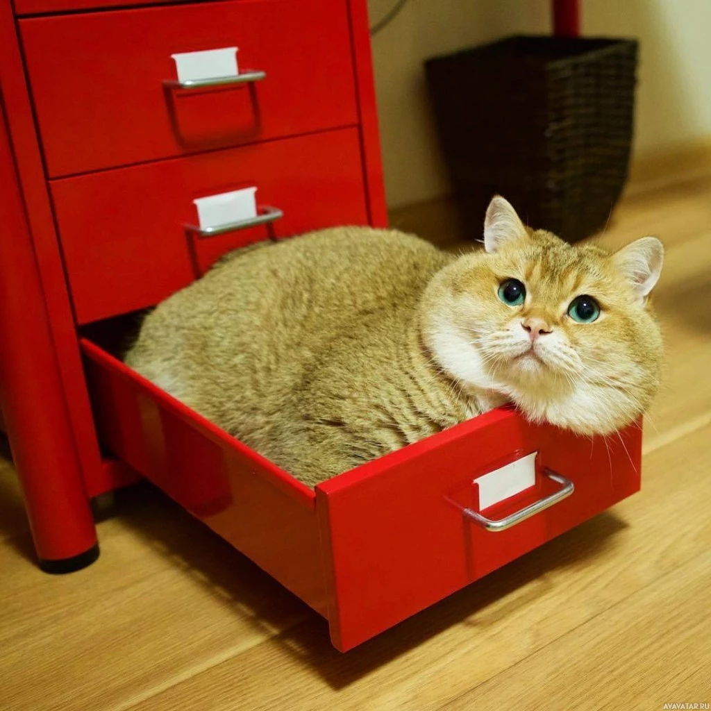 white cat lying inside an open red desk drawer. The cat's eyes are wide open, giving it a curious or surprised expression. Behind the cat is a red