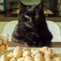 a black cat sitting at a table. In front of the cat, there is a plate of pastries, which appears to be filled with crescent-shaped