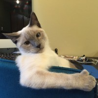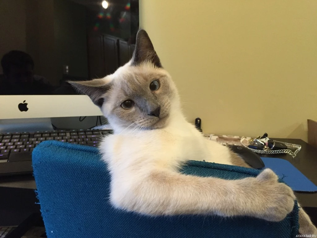 an office chair with its arm resting casually on the chair. The cat is looking towards the camera with a somewhat curious or surprised expression. In the background, there's a computer desk with a keyboard and monitor, suggesting that this scene might take place in a home