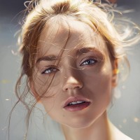 a soft expression, with her lips slightly parted as if she is caught mid-speech or perhaps lost in thought. Her eyes are looking directly at the viewer, creating a connection. The lighting on her face suggests either sunlight streaming through the window or an indoor light that gives off