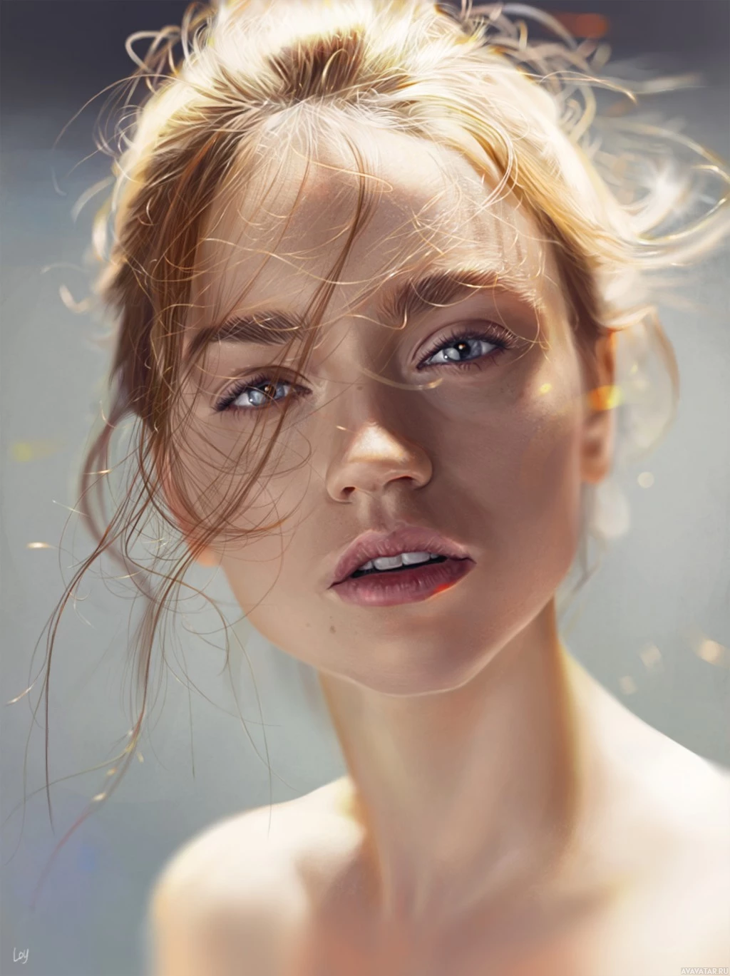 a young woman with her hair blowing in the wind. She has