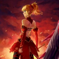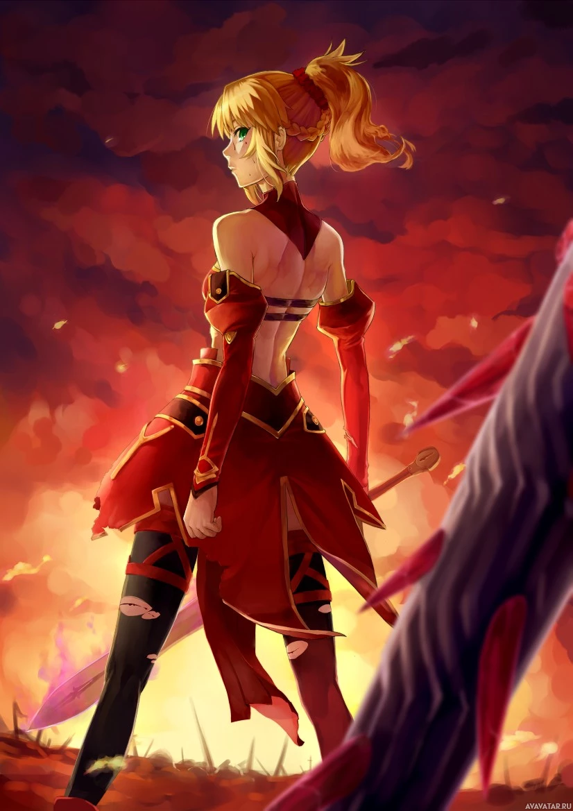 blonde hair tied back with what seems to be a magical or ornamental hair accessory. Her outfit consists of a red and black armor that suggests she is ready for battle, with intricate detailing on