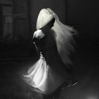 long hair is blowing slightly, suggesting there may be a breeze. She seems to be looking down towards something that she is holding, but it's not clear from this angle what that might be. The background is quite dark and somewhat indistinct, which contributes to the ethereal quality of the photograph.