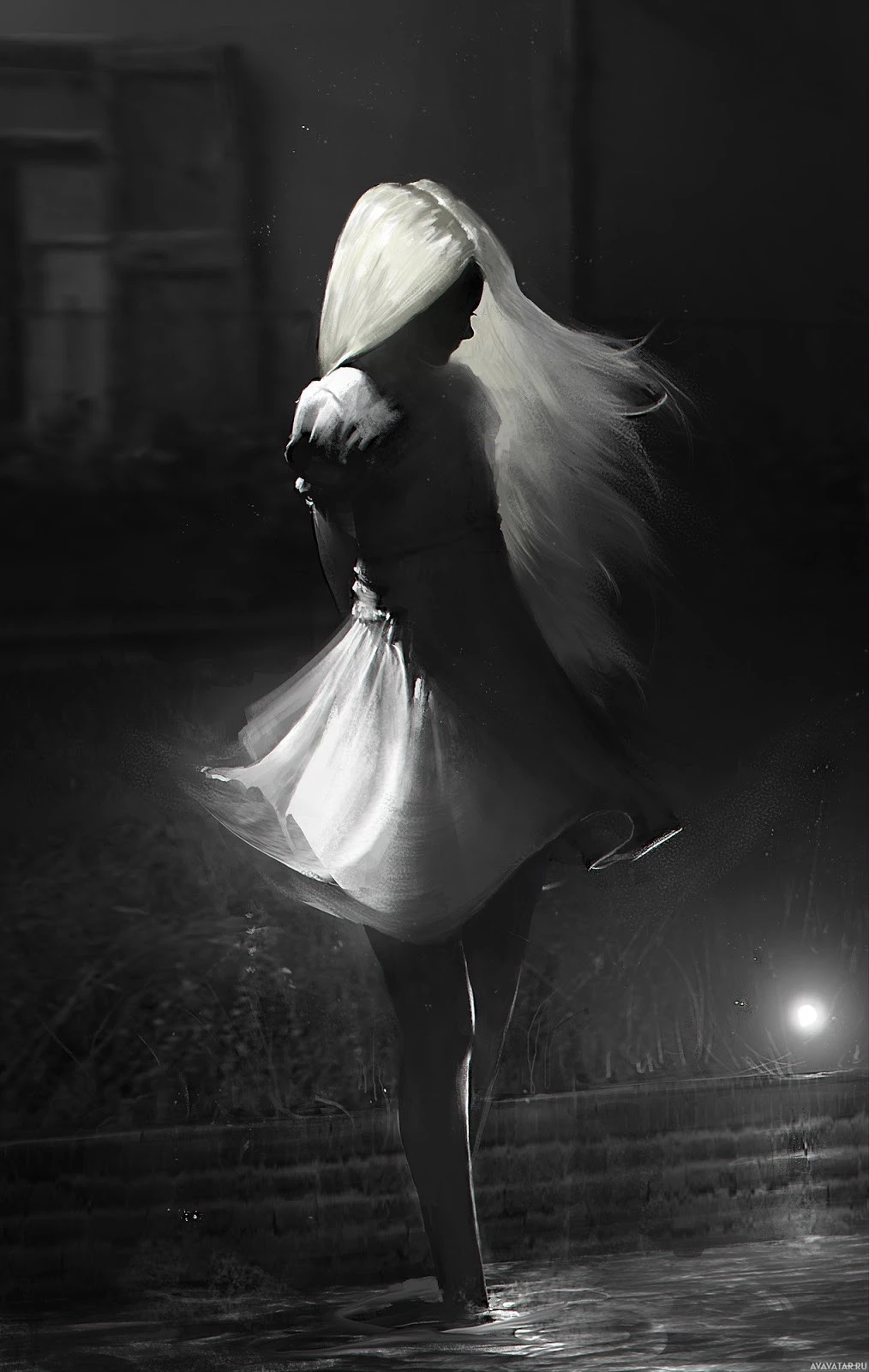 blonde hair, dressed in a light-colored dress, standing in an outdoor setting during what appears to be either dawn or dusk given the low light conditions. Her