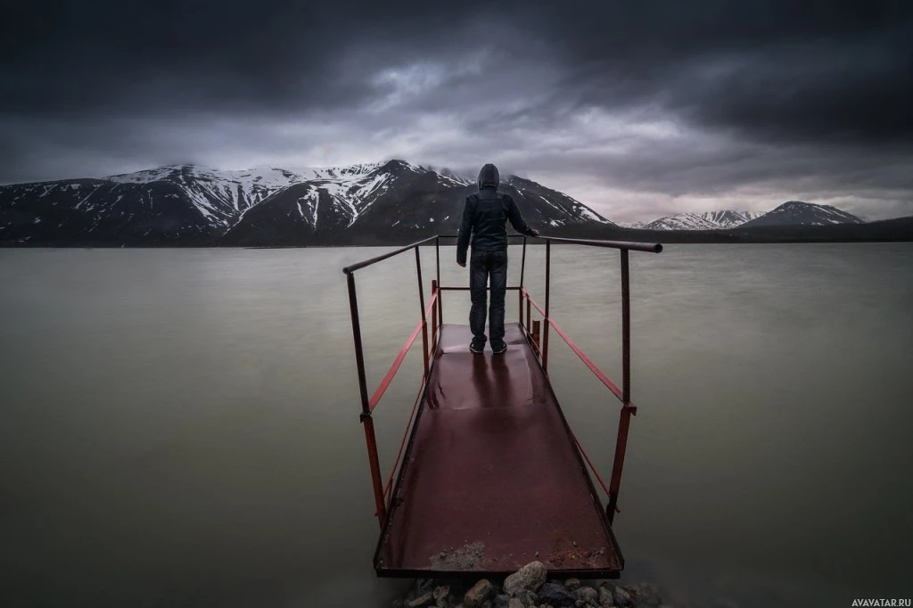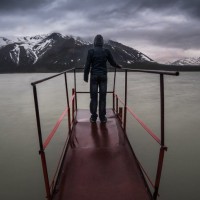 a body of water, possibly a lake or a calm sea. The individual appears to be wearing a hood and looking out towards the horizon where mountains are visible under