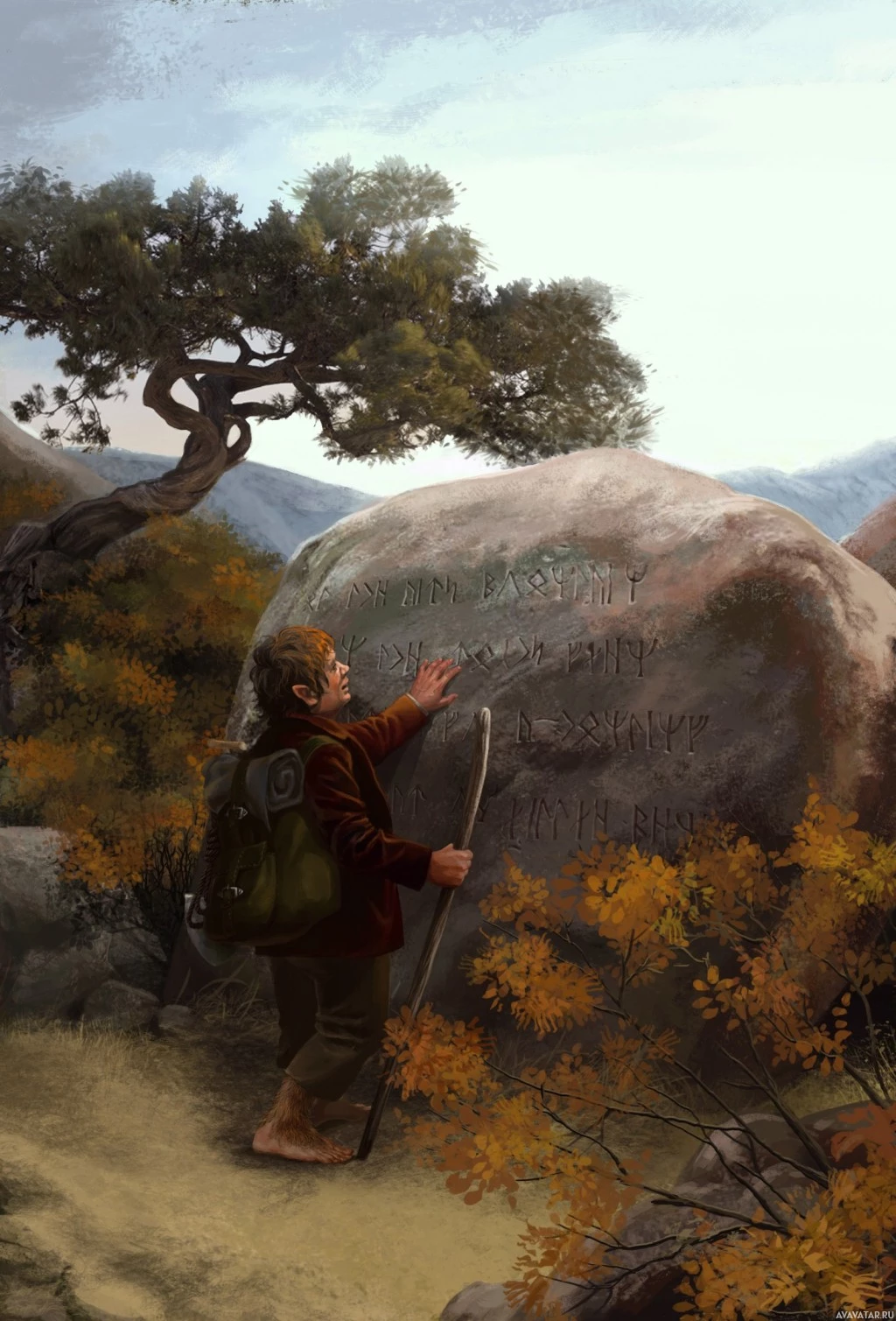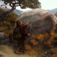 a mountainous landscape. The hobbit is looking at and pointing towards some writing or inscription on