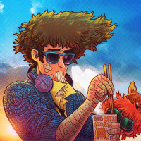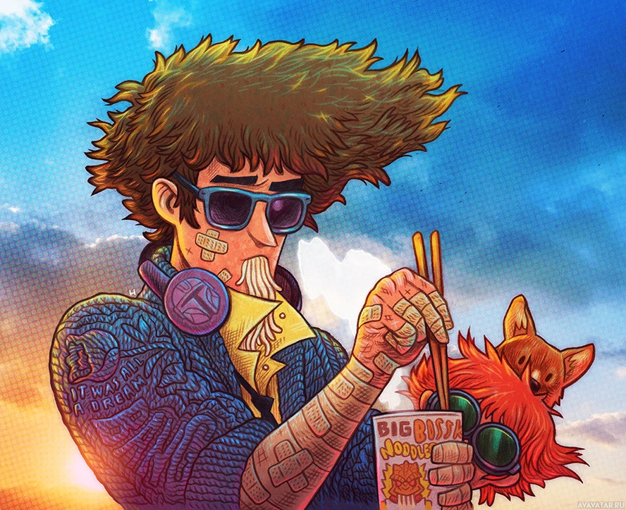 an illustrated character, who appears to be a male with shoulder-length hair that stands up in the air. He is wearing sunglasses and has